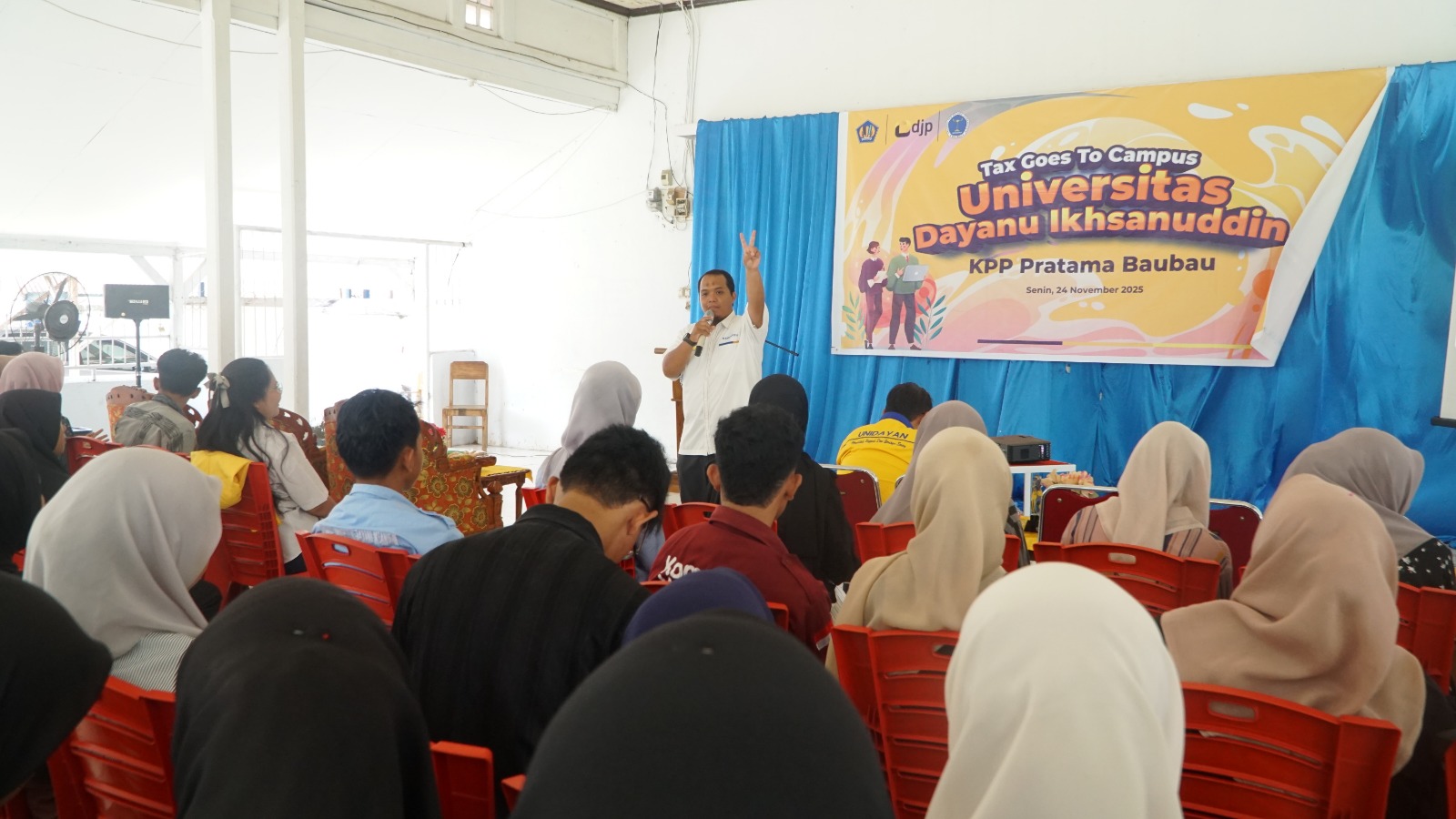 Unidayan mendapat kunjungan dari kantor Pelayanan Pajak Pratama Baubau dalam kegiatan Tax Goes to Campus 2025. Program ini merupakan bagian dari upaya KPP Pratama Baubau dalam meningkatkan inklusi kesadaran perpajakan kepada generasi muda perguruan tinggi. Kegiatan ini terselenggara pada Hari Senin, 24 November 2025 bertempat di Aula Istana Ilmiah dengan menghadirkan peserta dari mahasiswa utusan dari tiap program studi lingkup Unidayan.