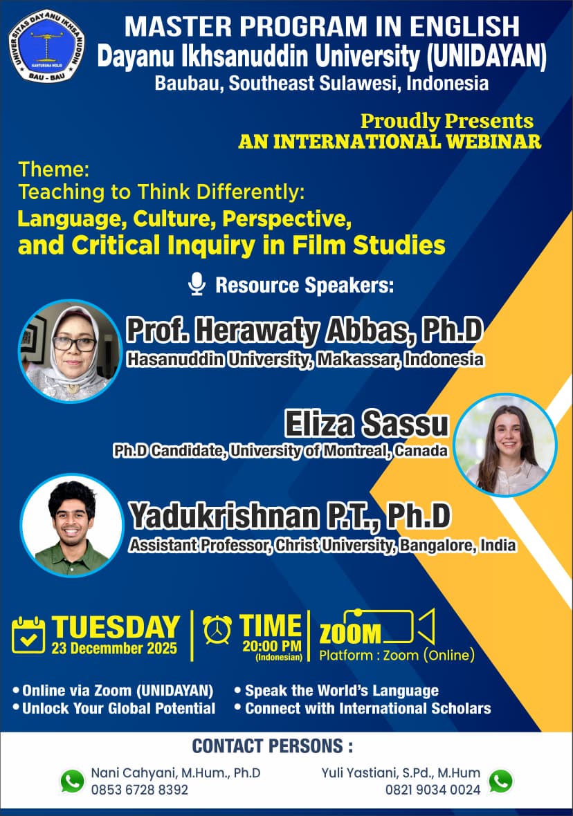 Program Magister Pendidikan Bahasa Inggris Universitas Dayanu Ikhsanuddin (Unidayan) Baubau, Sulawesi Tenggara mengadakan Webinar Internasional dengan tema: