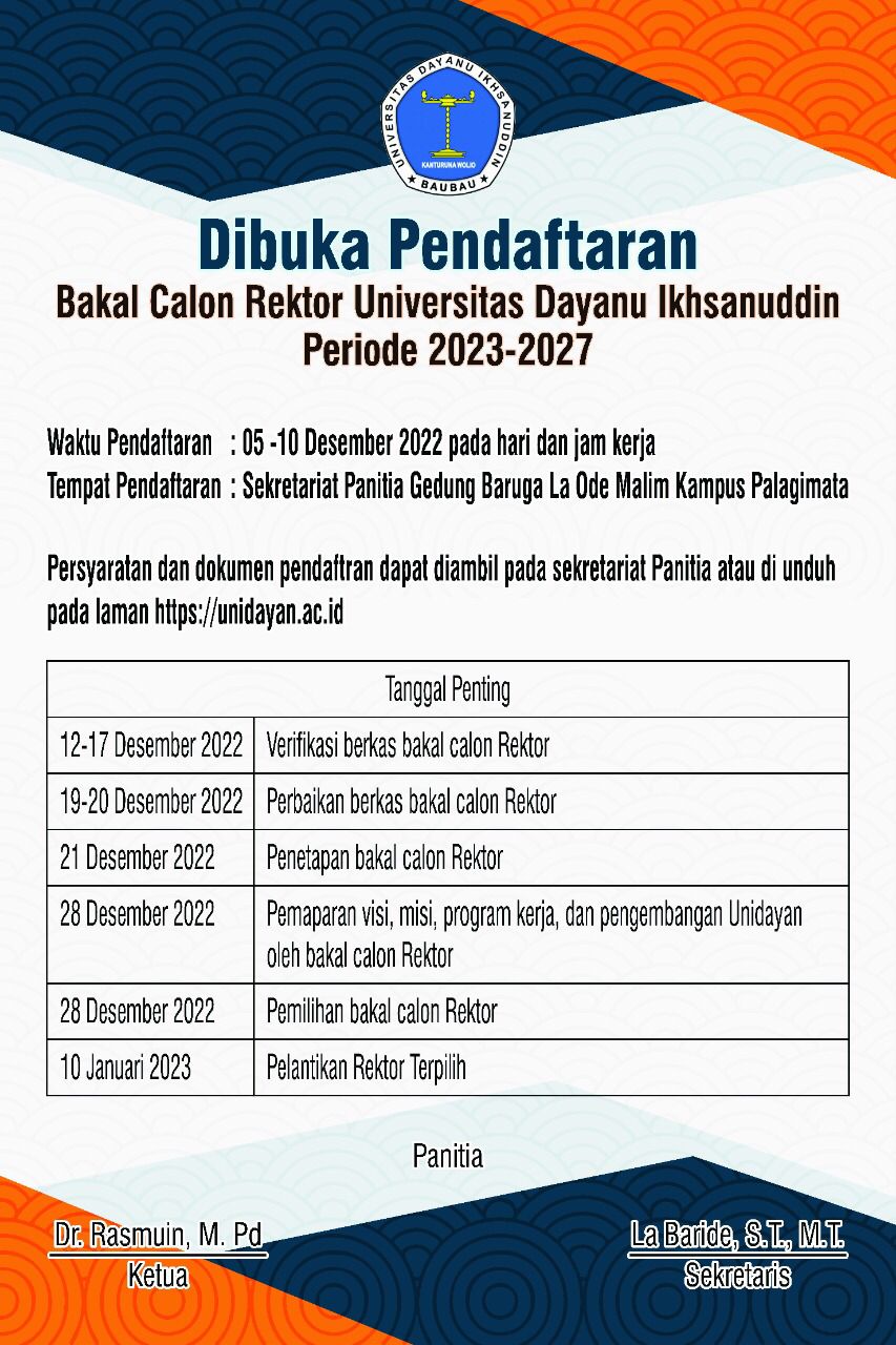 PENDAFTARAN BAKAL CALON REKTOR UNIVERSITA DAYANU IKHSANUDDIN PERIODE 2023 - 2027