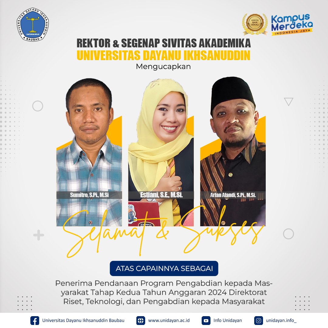 Rektor dan Segenap Sivitas Akademik Universitas Dayanu Ikhsanuddin mengucapkan selamat dan sukses kepada dua tim pengabdian masyarakat atas pencapaian luar biasa mereka sebagai penerima pendanaan Program Pengabdian Kepada Masyarakat Tahap Kedua Tahun Anggaran 2024 dari Kementerian Pendidikan, Kebudayaan, Riset, dan Teknologi.