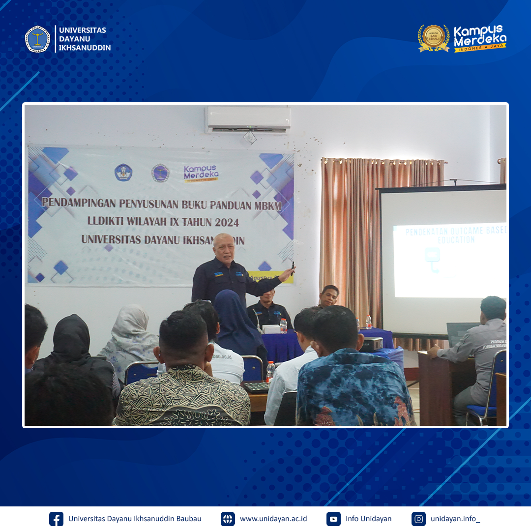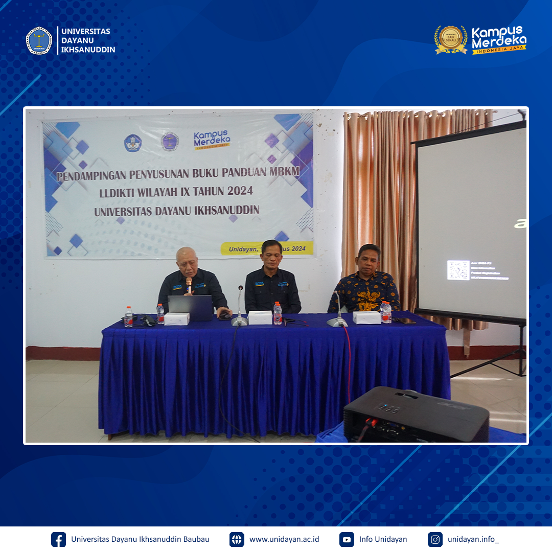 Baubau, 1 Agustus 2024 - Universitas Dayanu Ikhsanuddin menjadi tuan rumah dalam acara Pendampingan Penyusunan Buku Panduan Merdeka Belajar Kampus Merdeka (MBKM) yang diselenggarakan oleh LLDIKTI Wilayah IX. Acara yang diadakan di Ruang Rektorat Universitas Dayanu Ikhsanuddin ini dihadiri oleh perwakilan dari delapan perguruan tinggi di Kepulauan Buton, yaitu Universitas Dayanu Ikhsanuddin, Universitas Muslim Buton, Universitas Karya Persada Muna, Universitas Muhammadiyah Buton, STIKES IST Buton, Politeknik Baubau, Institut Teknologi dan Bisnis Muhammadiyah Buton, dan STKIP Pelita Nusantara Buton.