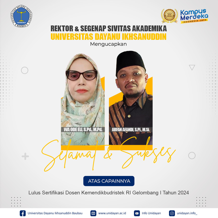 Sekali lagi, selamat dan sukses kepada para dosen yang telah meraih sertifikasi dosen tahun 2024. Semoga prestasi ini menjadi inspirasi bagi seluruh civitas akademika Universitas Dayanu Ikhsanuddin untuk terus berkarya dan berprestasi.