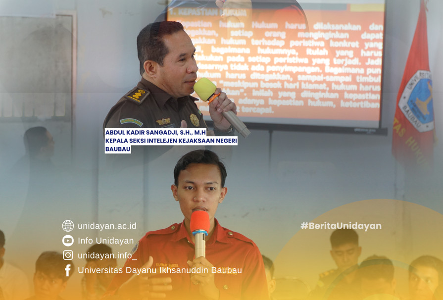 Mengusung tema “Penegakan Hukum yang Berkeadilan”, kegiatan ini dipimpin langsung oleh Kepala Seksi Intelijen Kejaksaan Negeri Baubau, Bapak Abdul Kadir Sangdji, S.H., M.H. Penyuluhan ini bertujuan untuk menanamkan pemahaman hukum kepada mahasiswa, serta membuka wawasan mereka mengenai prinsip-prinsip keadilan dalam penegakan hukum di Indonesia.