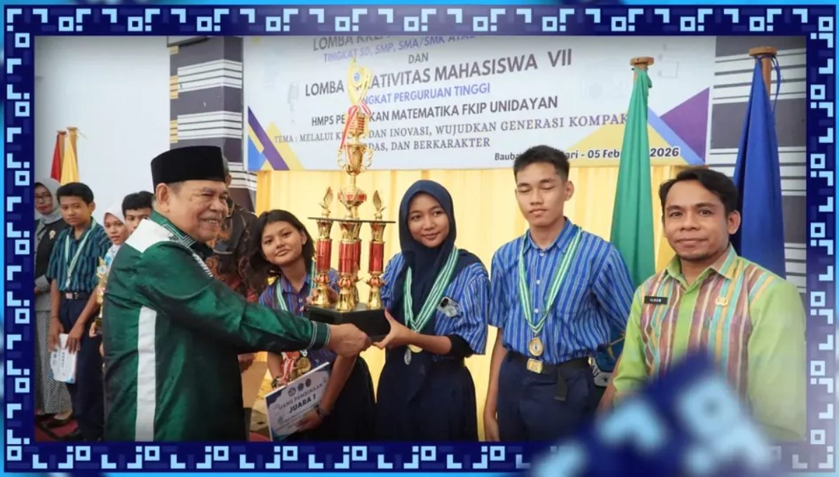 Baruga La Ode Malim, Kamis, 5 Februari 2026 - Dalam suasana penuh semangat, acara penutupan Lomba Kreativitas Siswa Ke-27 dan Lomba Kreativitas Mahasiswa Ke-7 dalam bidang Matematika dan seni berlangsung di Baruga La Ode Malim. Acara ini merupakan prakarsa dari Himpunan Mahasiswa Program Studi Pend. Matematika FKIP Unidayan yang mengusung tema "Melalui Kreasi dan Inovasi, Wujudkan Generasi Kompak, Cerdas dan Berkarakter", berhasil terselenggara dengan baik.🎉
