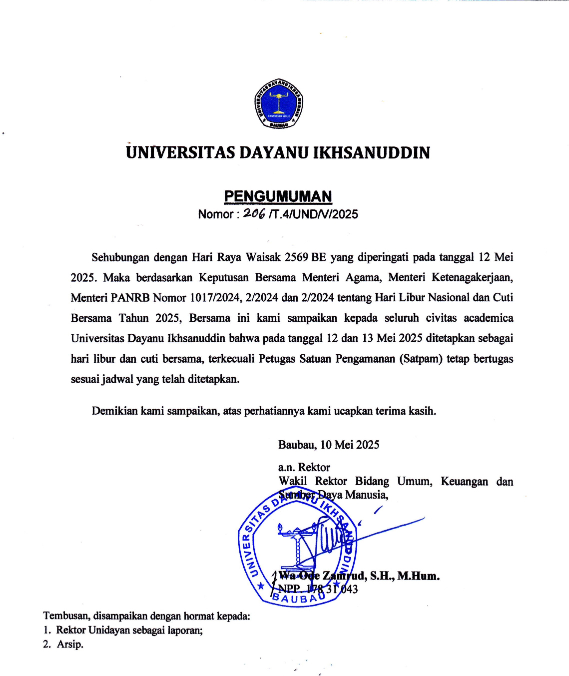📌 Tanggal 12 dan 13 Mei 2025 ditetapkan sebagai Hari Libur Nasional dan Cuti Bersama di lingkungan Universitas Dayanu Ikhsanuddin.